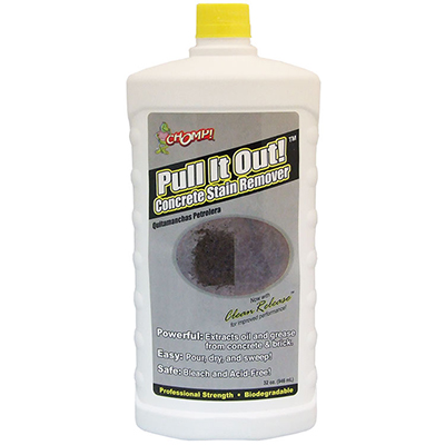 CHOMP PULL IT OUT CONCRETE STAIN REMOVER – Uses a deep penetrating formula to lift stains from porous flooring surfaces like concrete and brick. It is effective on oil or petroleum-based stains (transmission fluid, brake fluid, etc.) commonly found on concrete and paver driveways, garage floors, parking lots, and drive-through lanes. Simple & Safe. Unlike other stain removers that use harmful chemical compounds to attack tough oil and grease stains, Pull It Out stain remover helps to address these problems safely and simply. Although it goes a long way in removing difficult stains from concrete and other porous surfaces, Pull It Out does not contain bleach, acid, or other potentially hazardous materials. This cleaning formula is convenient and easy to use. Simply pour a small amount of the formula onto any oily or petroleum-based stain to cover it and allow it to dry. As it dries, the pull it out formula draws out the contamination causing the stain. Once the cleaning formula is dry, you can easily brush it away like chalk dust, revealing a stain-free, safer surface.